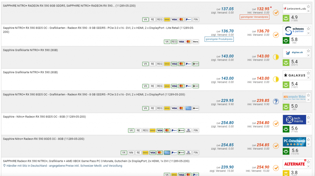 Heute gab’s bei der Grafikkarte SAPPHIRE Radeon RX 590 Nitro+ OC, Radeon RX 590, 8.0GB GDDR5, PCI-Express einen Preissturz. War bis heute nicht für unter CHF 234.- erhältlich, nun gibt’s die Grafikkarte bei diversen Händlern für ab CHF 132.-