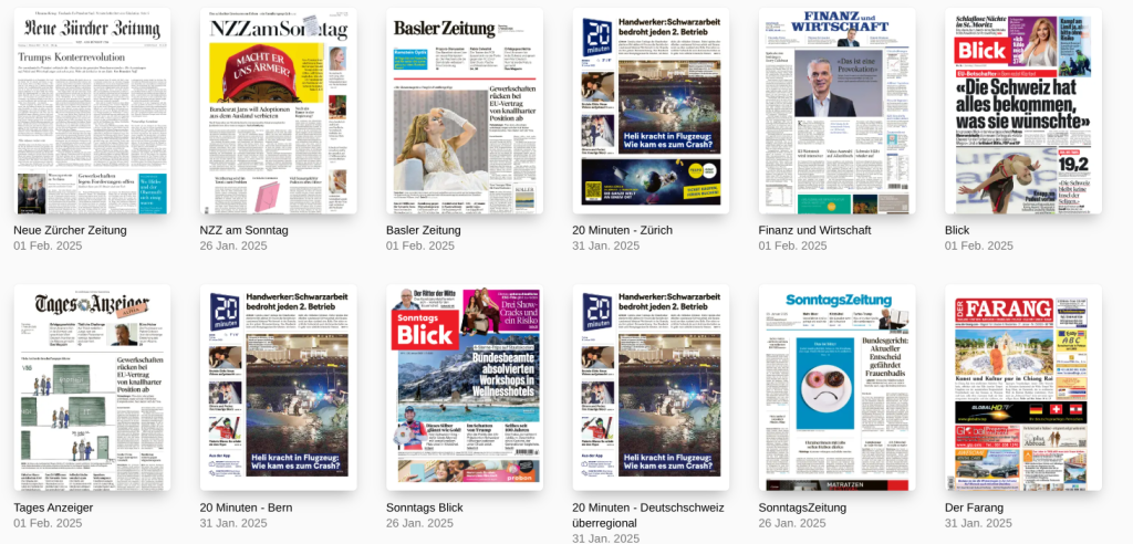 Ich habe den PressReader sogar kostenlos über meine lokale Bibliothek, aber dort sind nicht alle Schweizer Zeitungen mit dabei.