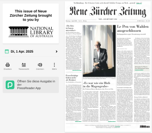 Ab dem 1. April 2025 gibt es die NZZ nicht mehr als E-Paper auf Pressreader, sondern nur noch exklusiv im NZZ-Aboshop (leider kein 1. Aprilscherz).