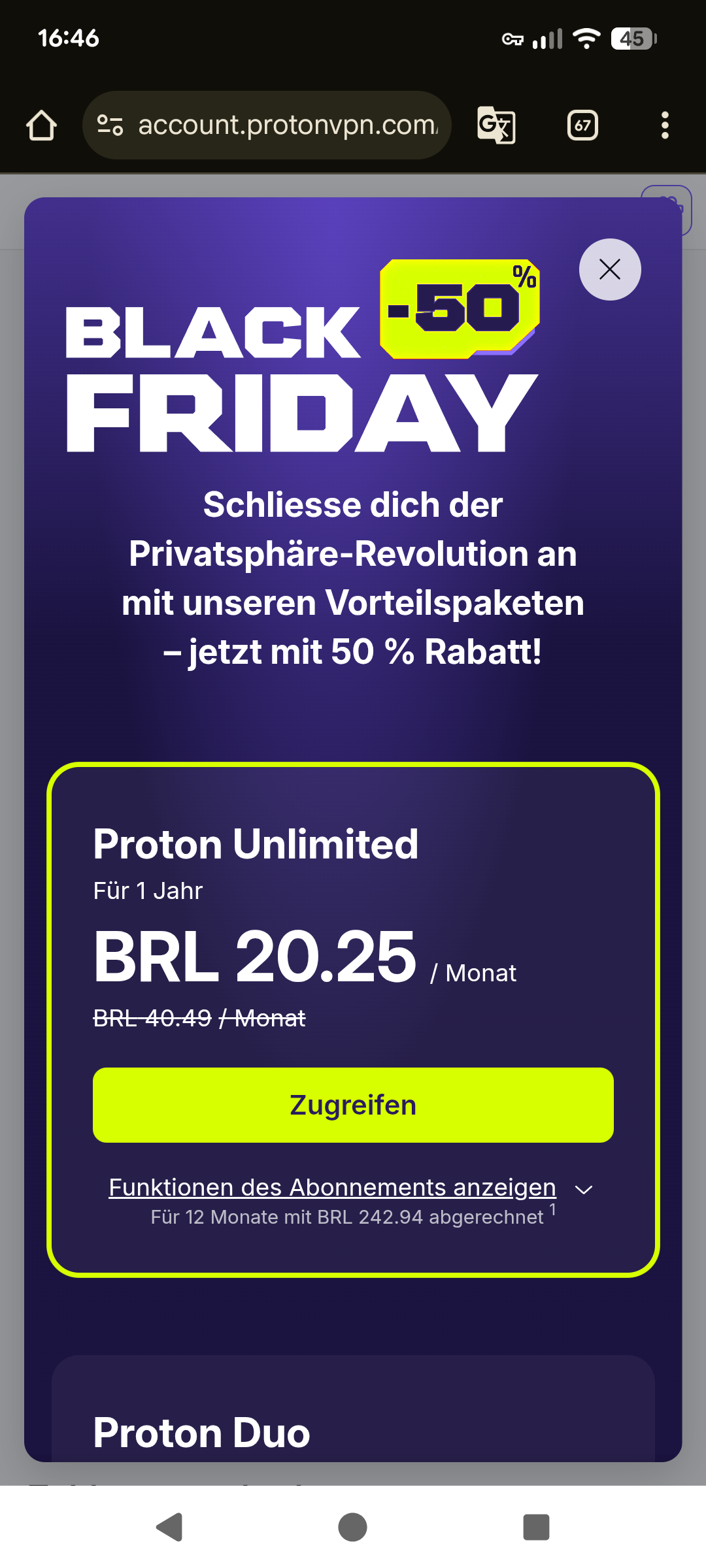 Aber du kannst 50% Rabatt erhalten, wenn du auf Proton Duo upgradest — es kostet nur 3.50 € extra pro Monat.)