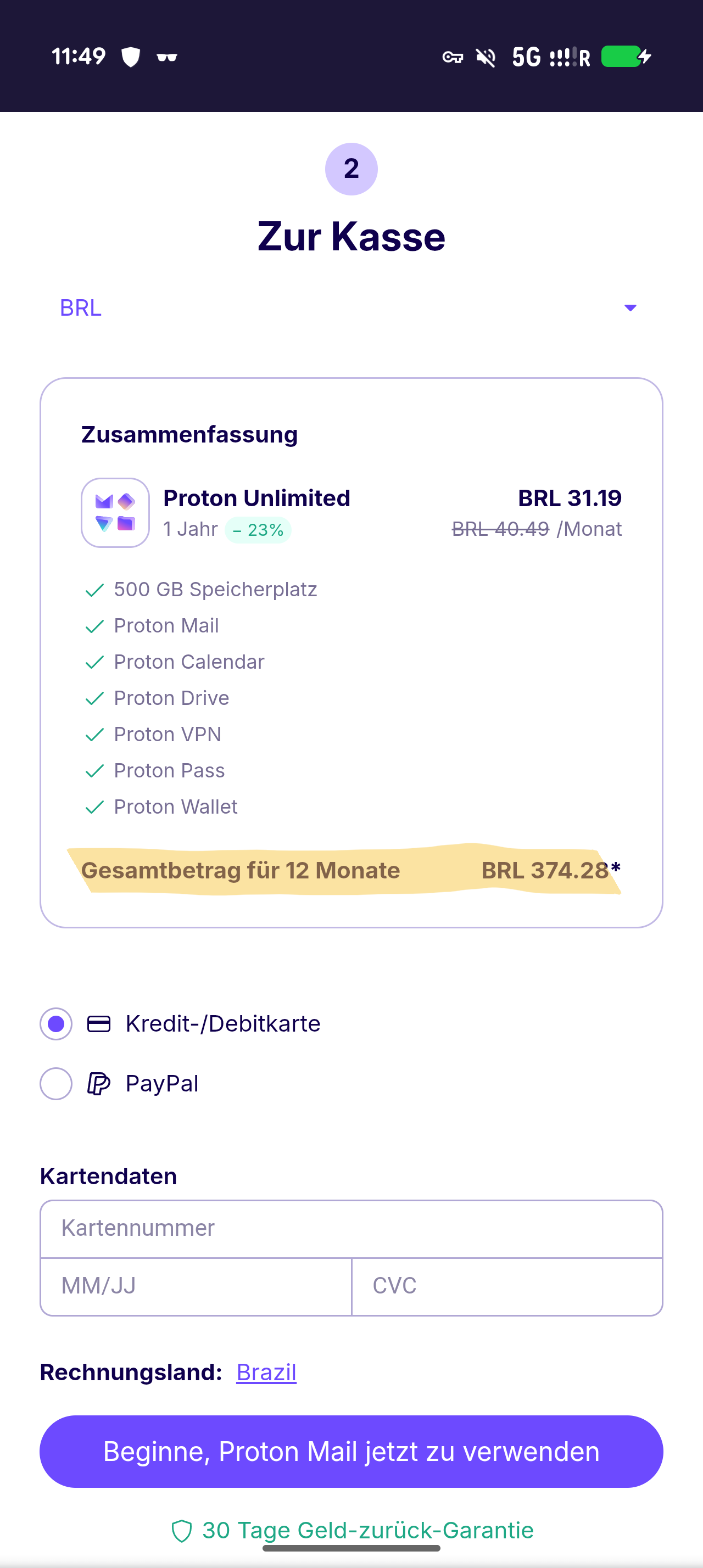 Proton Mail Plus für 148.68 BRL (CHF 22.10) im ersten (und wie es aussieht auch in den darauffolgenden Jahren?)