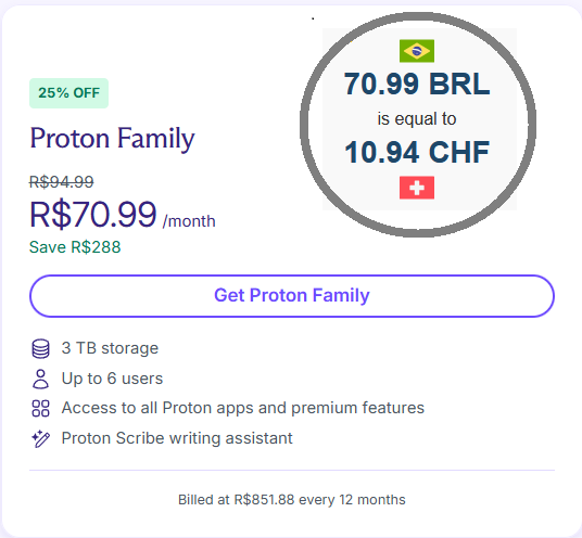 Teile Proton mit deiner Familie oder Freunden und erhalte Proton Unlimited bereits ab 2.- CHF. pro Monat & Benutzer. Inkl. Mail, VPN, Drive, Calender, Pass und Wallet. Um die genannten Preise zu erhalten, müsst Ihr ein Wurmloch nach Brasilien aktivieren. Angekommen und eingecheckt ist keine Adresseingabe notwendig. Bezahlt den Jahrespreis in der Landeswährung BRL mit CH Kreditkarte.