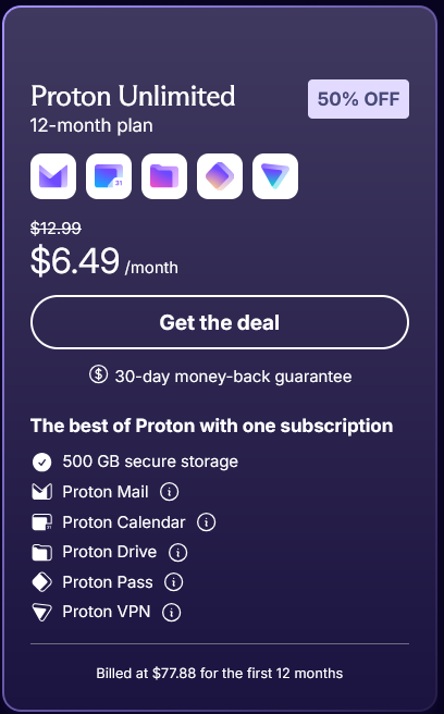 - 12 Monate Proton Unlimited 77.88 USD = 67.20 CHF. (5.60 CHF. / Monat)