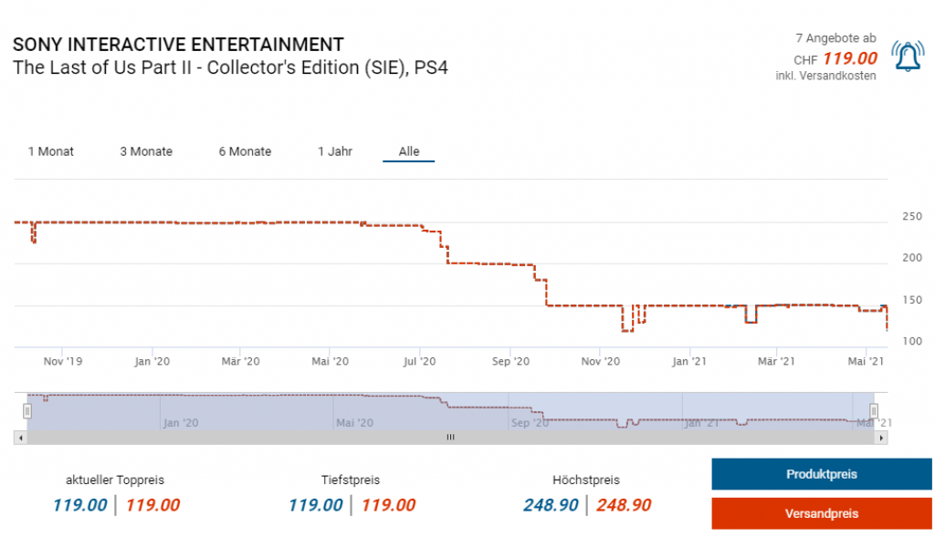 Bei Mediamarkt gibts derzeit in der Outlet-Sparte das kontroverse Spiel The Last of Us Part II in der Collector’s Edition zum Bestpreis von 119 Franken. Laut toppreise konnte man diese Version zuletzt in der Black Friday Woche zu diesem Preis ergattern.