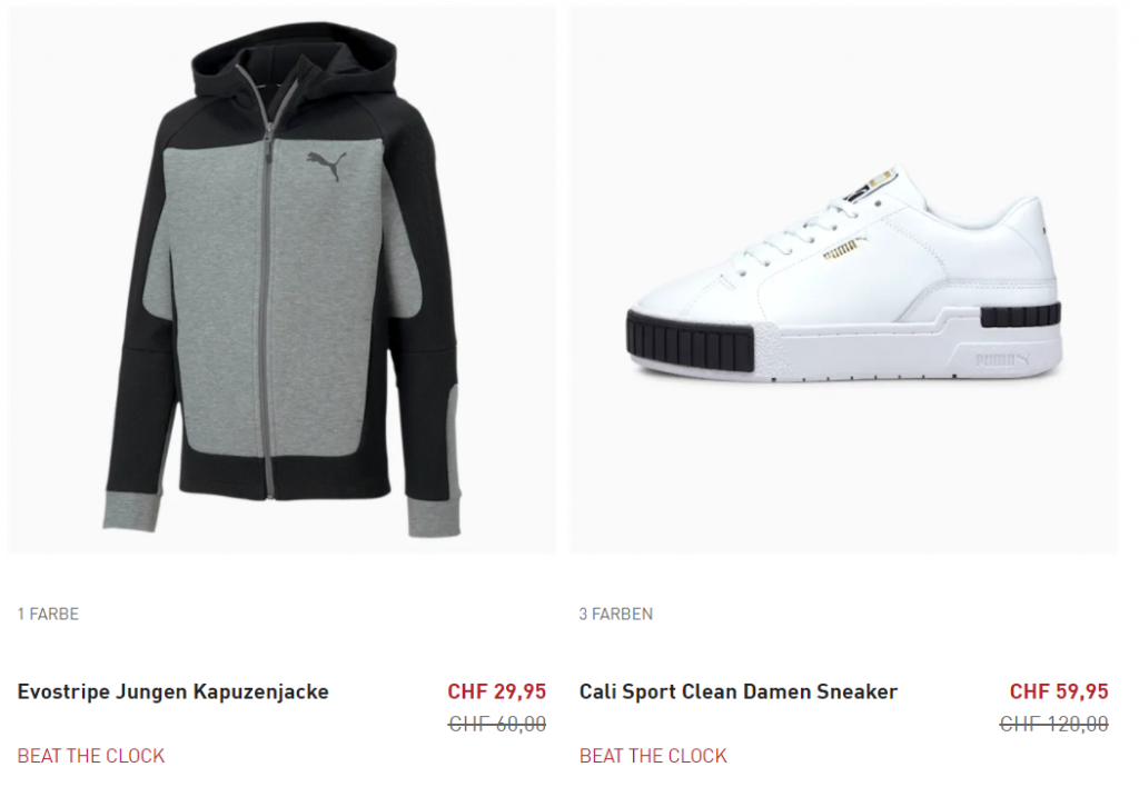 Bei PUMA gibt’s mit dem Gutscheincode BEAT 25% Extra-Rabatt auf alle SALE-Artikel. Nur bis um 14.00 Uhr gültig, anschliessend gibt’s bis um Mitternacht noch 15% Extra-Rabatt. Hier einige Beispiele - die 25% werden zusätzlich abgezogen!