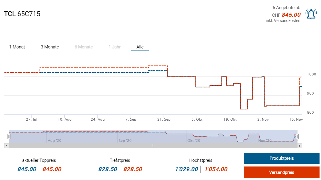 Bei digitec gibts derzeit den QLED-Fernseher TCL 65C715 wieder einmal zum Aktionspreis von 845 Franken. Laut toppreise solls den Preis schon seit längerer Zeit geben, ich konnte zu diesem Gerät aber keinen Deal auf Preispirat vorfinden.