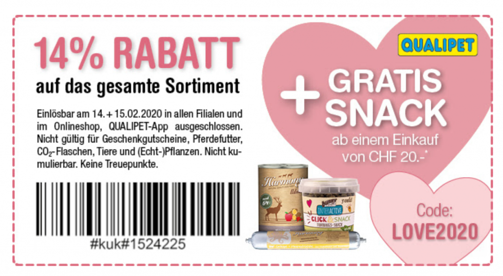 *Gültig vom 14.-15. Februar 2019 in allen QUALIPET Filialen und www.qualipet.ch, Code: LOVE2020 - QUALIPET App ausgeschlossen. Nicht gültig für Geschenkgutscheine, Pferdefutter und Tiere. Nicht kumulierbar. Keine Treuepunkte. Ein Snack pro Kunde und ab CHF 20.-Einkauf.