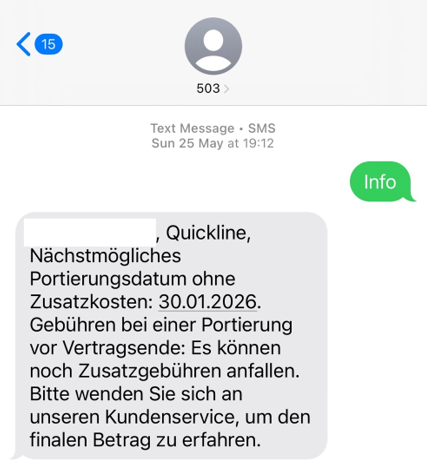 - Sendet eine SMS mit dem Text INFO an 503. So erfährt ihr, wann euer Portierungsdatum sein wird.