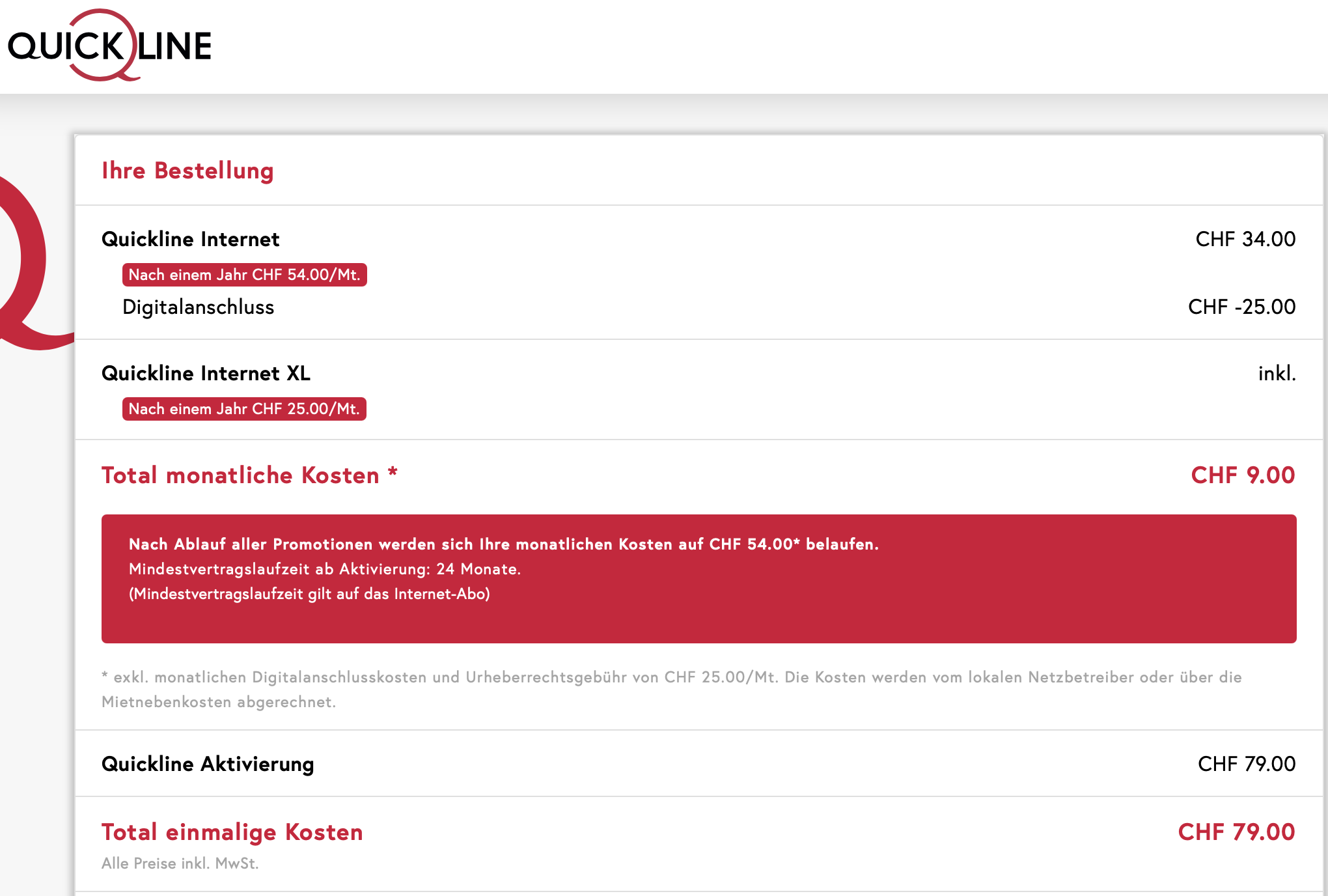 Die CHF 9 in deiner Rechnung gelten nur, wenn du im Quickline-Netz bist, und die CHF 25 für den Digitalanschluss über die Nebenkosten bezahlst.