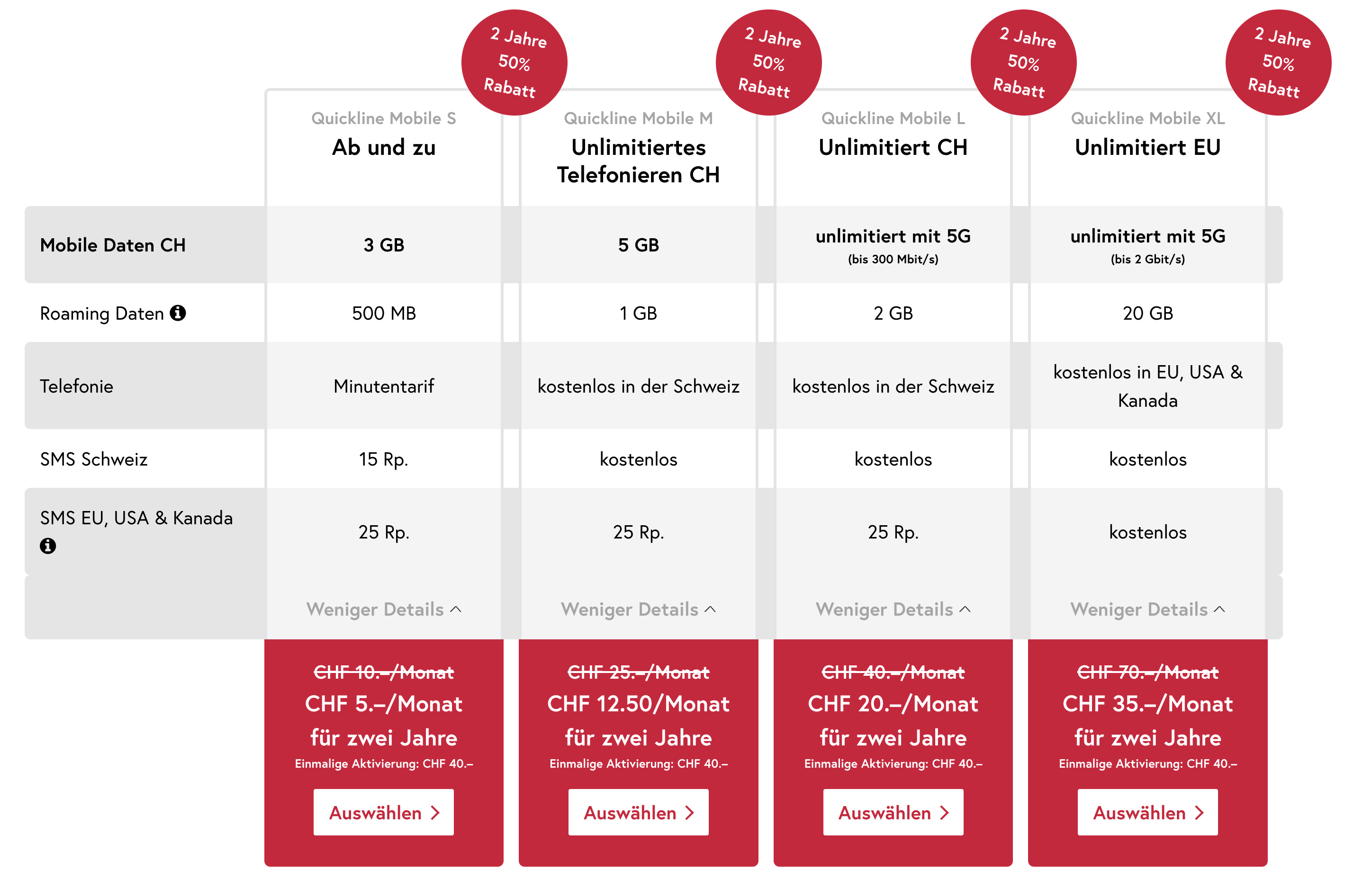 Über deinabo lassen sich momentan alle Mobile-Abos von Quickline mit 50% Rabatt und ohne Aktivierungsgebühren abschliessen.