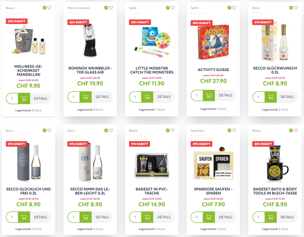 Bei Gifts werden die ganze Woche unterschiedliche Artikel reduziert. Die Angebote gelten, solange der Vorrat reicht und können deshalb stündlich ändern. Die Versandgebühren von CHF 6.90 müssen allerdings vom Kunden übernommen werden.