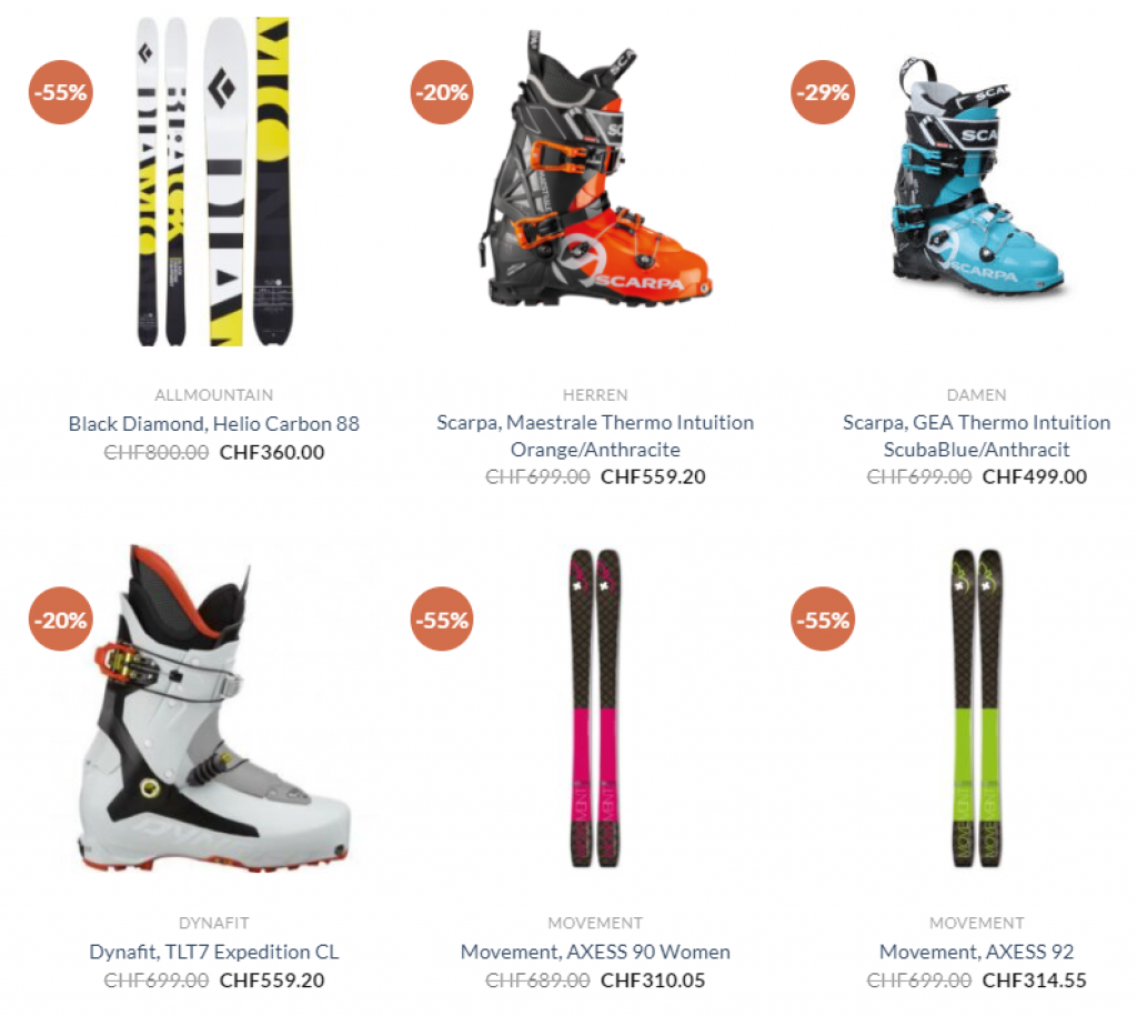 Zum Beispiel gibt es die Allmountain Skis “Revolut 95” von Völkl für CHF 224.55 anstatt für CHF 499.-. Oder die Movement Skis “AXESS 90 WOMEN” 55% günstiger für CHF 310.05.
