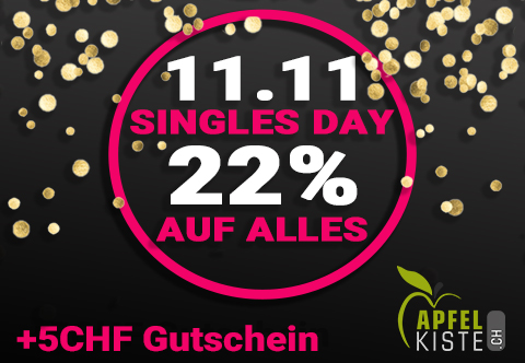 Bei Apfelkiste.ch am Singles Day von ganzen 22% Rabatt auf das gesamte Sortiment profitieren und ab 40 CHF Einkaufswert einen gratis 5 CHF Gutscheincode abstauben!