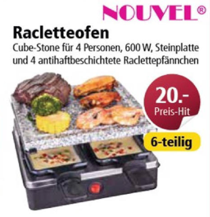 Zum Beispiel gibt’s einen Racletteofen von Nouvel mit Steinplatte für insgesamt 4 Personen in Aktion zum kleinen Preis von 20 Franken. Mit dabei sind 4 Raclettepfännchen.