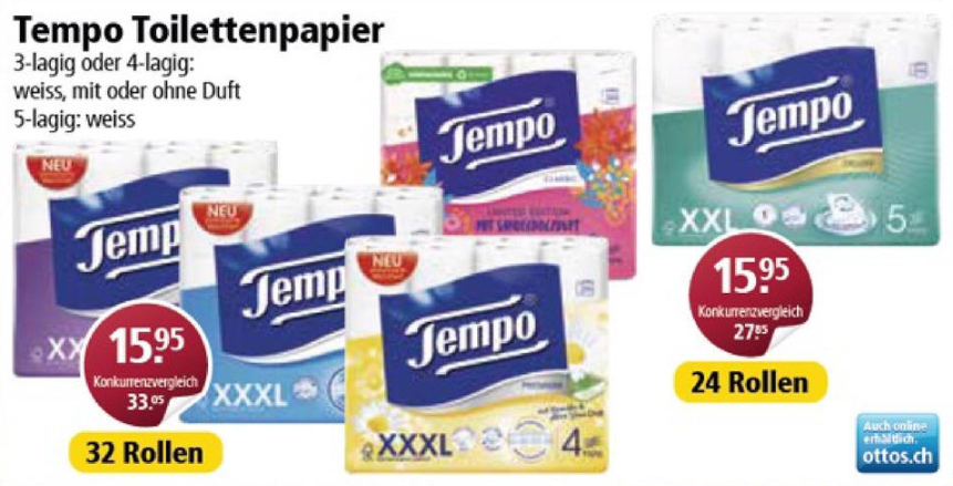 Ebenfalls stark reduziert sind diverse Variationen des Toilettenpapiers der Marke Tempo. Hier findet ihr wahlweise 32 oder 24 Rollen mit 3-5 Lagen für 15.95 Franken.