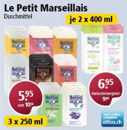 Und auch das beliebte, wohlduftende Duschgel von Le Petit Marseille gibt’s im 3er-Pack à 250ml Flasche reps. 2er-Pack à 400ml Flasche für CHF 5.95 resp. CHF 6.95.