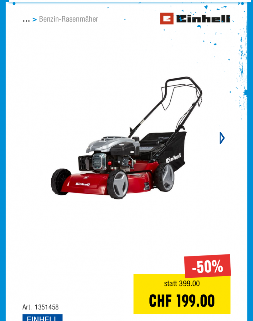 Aktuell gibt es eine gute Aktion, wenn man in der Nähe eines Jumbos wohnt. Dann erhält man zu fast halben Preis einen Benziner Rasenmäher. Bei Versand sind es immerhin noch 100.- Rabatt…
