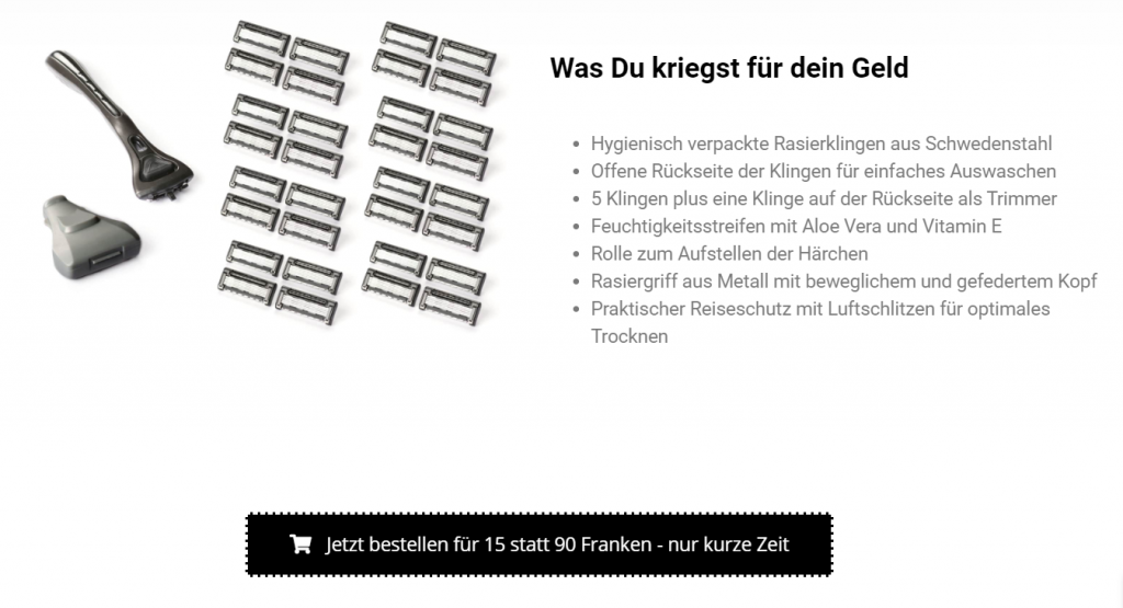 Bei zereffo.ch gibt’s auch dieses Jahr einen Black Friday Deal. Ihr erhaltet hier einen Griff aus Metall mit gefedertem Kopf, 32 Rasierklingen und einen Reiseschutz.