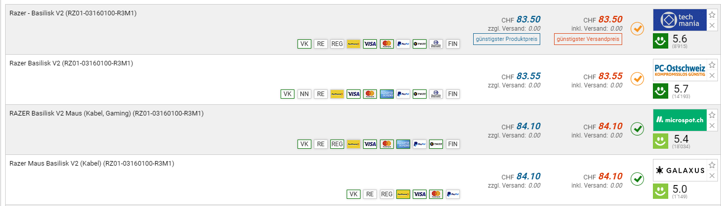 Bei DayDeal gibt es momentan die Razer Basilisk V2 Gaming Maus für den Bestpreis von CHF 69.-. Der Preis war vor 2 Wochen schon einmal so tief. Der zweitbeste Preis beträgt CHF 83.50.