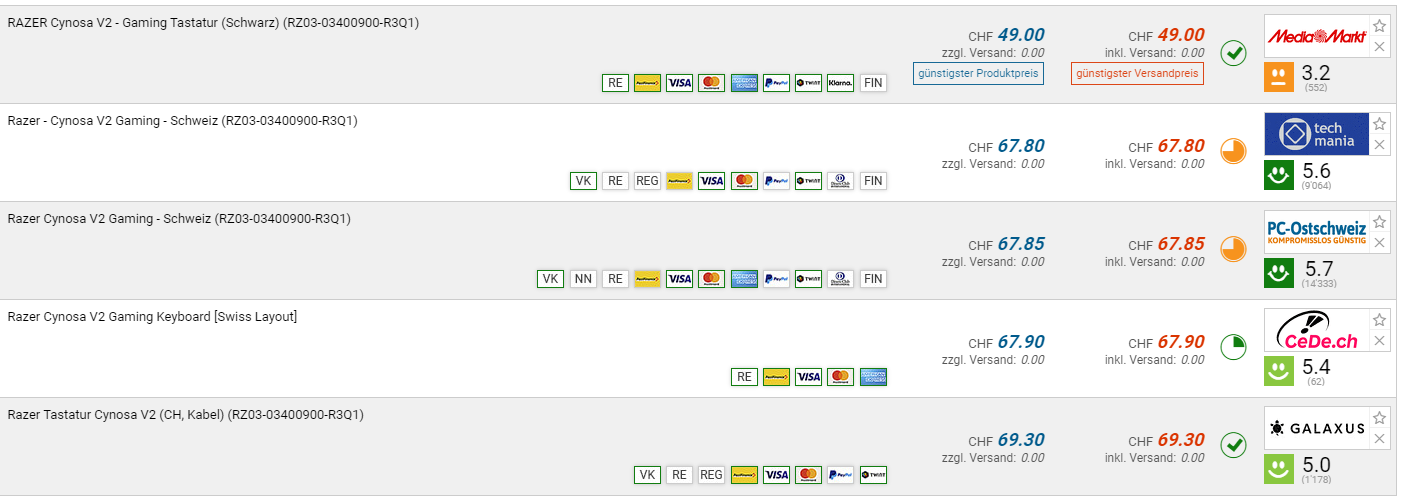 Bei Media Markt gibt es die RAZER Cynosa V2 Gaming Tastatur für den neuen Bestpreis von CHF 49.-. Der vorherige Bestpreis war CHF 66.-. Der zweitbeste Preis beträgt CHF 67.80.