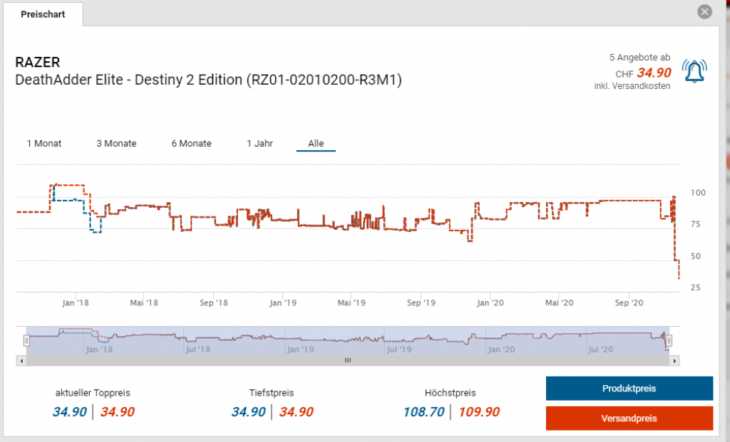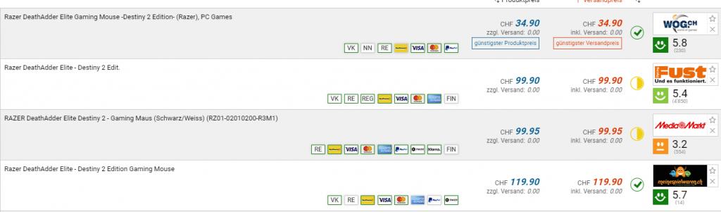 Bei WOG gibt es die RAZER DeathAdder Elite Gaming Maus in der Overwatch & Destiny Edition für den neuen Bestpreis von CHF 34.90. Der vorherige Bestpreis war CHF 65.-. Der zweitbeste Preis beträgt CHF 99.90.