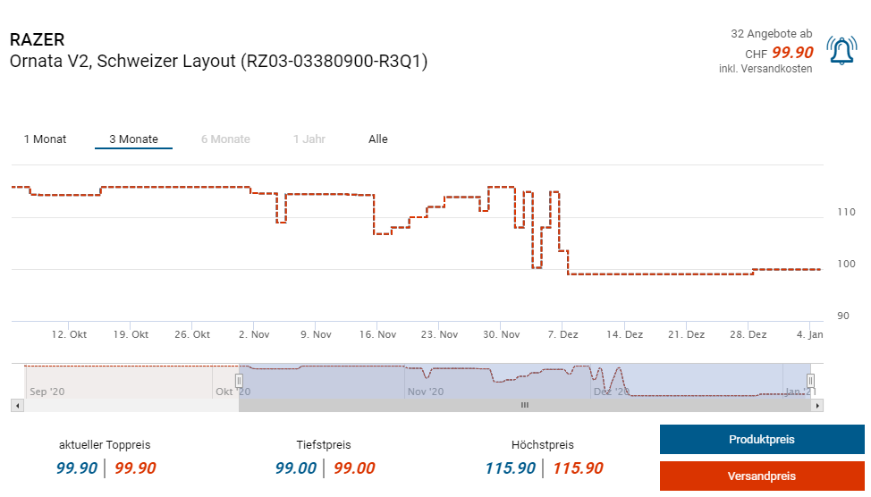 Bei melectronics gibts derzeit die Gaming-Tastatur Razer Ornata V2 zum Aktionspreis von knapp 100 Franken. Laut toppreise soll der Vergleichspreis bei 108 Franken liegen.