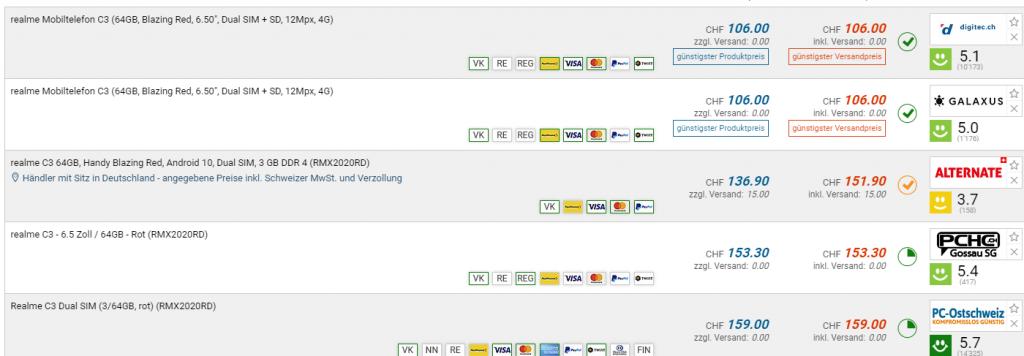 Bei digitec und galaxus gibt es das REALME C3, 64GB für den neuen Bestpreis von CHF 106.-. Der vorherige Bestpreis war CHF 112.-. Der zweitbeste Preis beträgt CHF 151.90.
