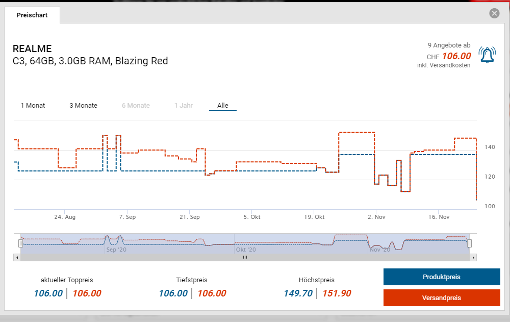 Bei digitec und galaxus gibt es das REALME C3, 64GB für den neuen Bestpreis von CHF 106.-. Der vorherige Bestpreis war CHF 112.-. Der zweitbeste Preis beträgt CHF 151.90.