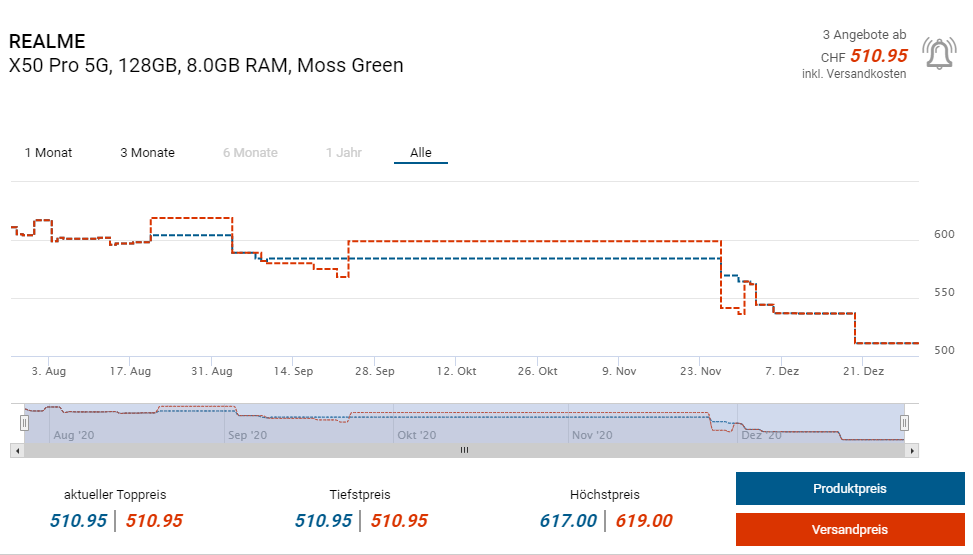 Bei Amazon gibts zurzeit das Realme X50 Pro in der 8/128GB Ausführung zum Preis von knapp 401 Franken inkl. Lieferung in die Schweiz, für die Ultra-Schnäppchenjäger unter uns wäre amazon.es allerdings nochmal etwa 7 Franken günstiger.