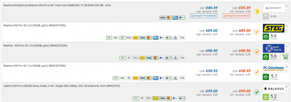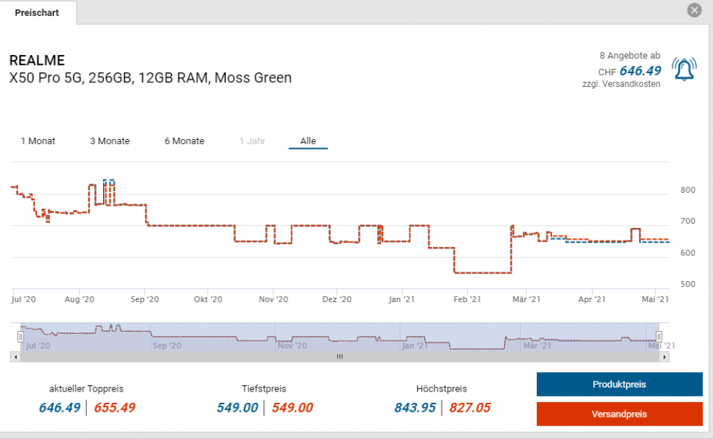 Bei Amazon.es kostet das REALME X50 Pro 5G Smartphone momentan ca. CHF 300.-. Der vorherige Bestptreis war CHF 549.-. Der zweitbeste Preis beträgt CHF 655.49.