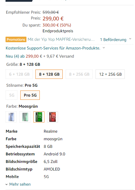 Bei Amazon.es kostet das REALME X50 Pro 5G Smartphone momentan ca. CHF 300.-. Der vorherige Bestptreis war CHF 549.-. Der zweitbeste Preis beträgt CHF 655.49.