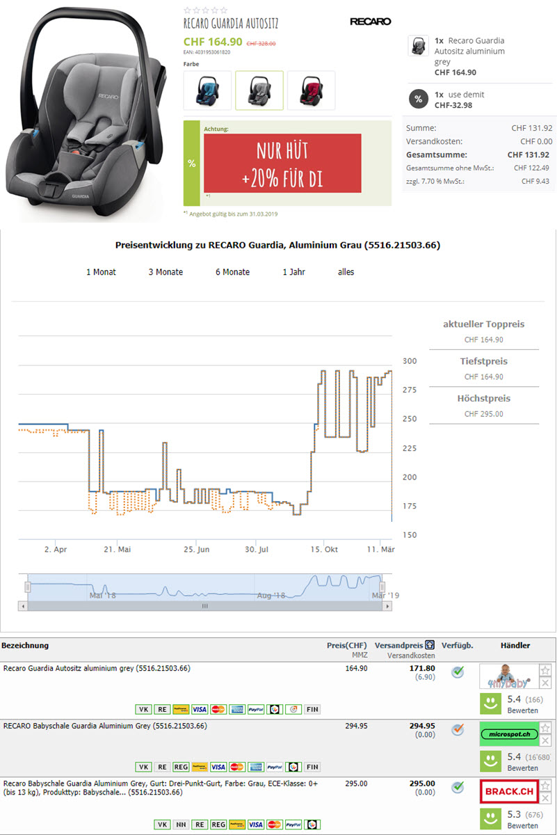 Bei 4mybaby gibt es momentan den Recaro Guardia Autositz in diversen Farben zum Preis von CHF 164.90. Gleichzeitig erhält man bis zum 31.3.2019 noch zusätzlich 20% Rabatt, was in einem sagenhaften Endpreis von CHF 131.95 (portofrei) resultiert (nächstbester Preis bei Brack mit CHF 294.95).