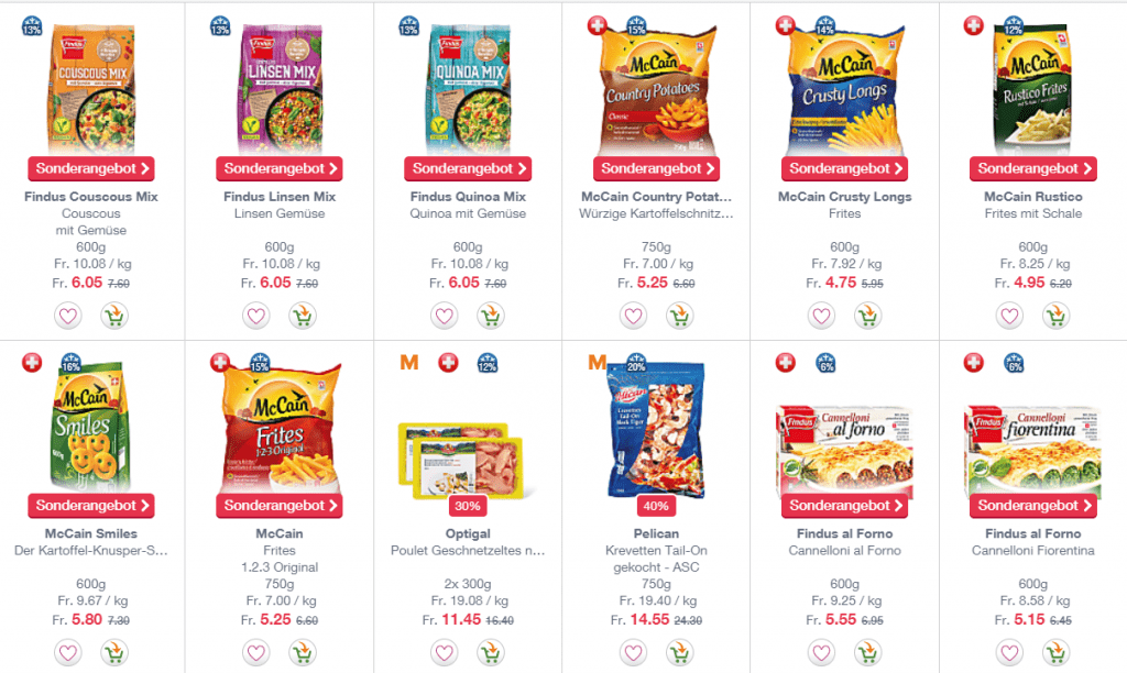 Zudem kann man sich momentan als Bestandeskunde günstig die Kühltruhe auffüllen: Sie erhalten Fr. 10.- Rabatt bei einem Einkauf von Tiefkühlprodukten im Wert von Fr. 30.-. Angebot gültig vom Montag, 14. Mai 2018 bis Sonntag, 27. Mai 2018. Soweit ich sehe braucht es dafür keinen Gutscheincode. Die Aktion ist auch gültig auf reduzierte Artikel: