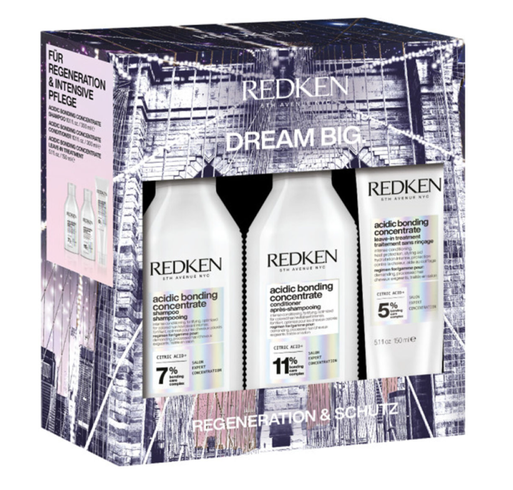 Das Redken Acidic Bonding Concentrate Weihnachtsset 2024 bietet herausragende Haarpflege und intensive Reparatur. Mit dem Acidic Bonding Concentrate Shampoo und Conditioner werden geschädigte Sulfitbrücken effektiv gestärkt, Haarbruch spürbar minimiert und Farbverlust zuverlässig verhindert. Das Acidic Bonding Concentrate Leave-In Treatment sorgt zusätzlich für geschmeidiges Haar und bietet Schutz vor schädlichen Umwelteinflüssen. Ideal als luxuriöses Geschenk oder zur Perfektionierung der eigenen Haarpflegeroutine, garantiert dieses Set professionelle Ergebnisse und sichtbar revitalisiertes, gesund aussehendes Haar.