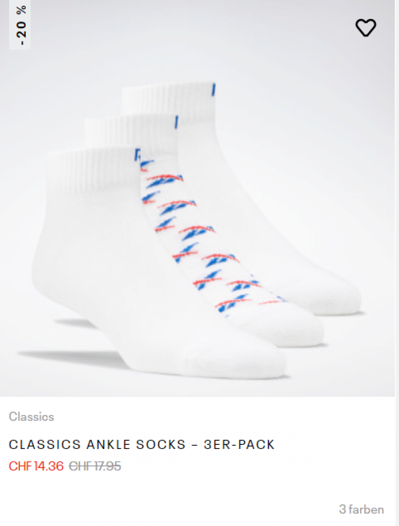 Bei Reebok findet gerade der End of Season Sale statt. Viele Artikel sind um 40-50% reduziert. Zusätzlich gibt’s jetzt mit dem Code EXTRA20 nochmals 20% Rabatt obendrauf. Zudem ist der Versand bereits ab einem Einkaufsbetrag von CHF 30.- gratis. Die Rücksendung von Artikeln (wenn mal etwas nicht gefallen sollte) ist während 100 Tagen gratis möglich.