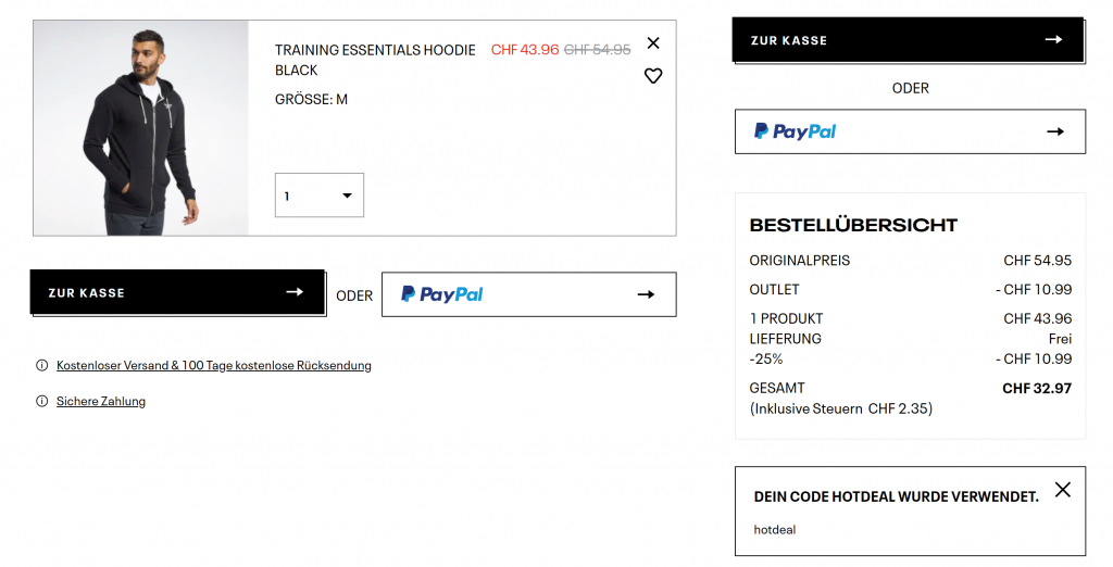 Schöner Hoodie bei Reebok: Den Training Essentials Hoodie erhält man mit dem Gutscheincode hotdeal für knapp 33 Franken. Die Lieferung ist zudem gratis und alle Grössen sind noch verfügbar.