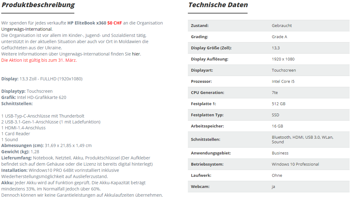 Bei der GEWA gibt’s derzeit wieder einmal ein besseres Angebot. So gibt’s das wiederaufbereitete, hochwertige Convertible HP Elitebook x360 mit i5-Prozessor der 7. Generation (ja, nicht der Schnellste) und für diese Preisklasse sehr stattlichen 16GB RAM + 512GB SSD zum Aktionspreis von 349 Franken! In dem Preis inbegriffen ist zudem eine Spende in der Höhe von 50 Franken für die Organisation „Ungerwägs-International“. Die Organisation ist vor allem im Kinder-, Jugend- und Sozialdienst tätig, unterstützt in der aktuellen Situation aber auch vor Ort in Moldawien die Geflüchteten aus der Ukraine.