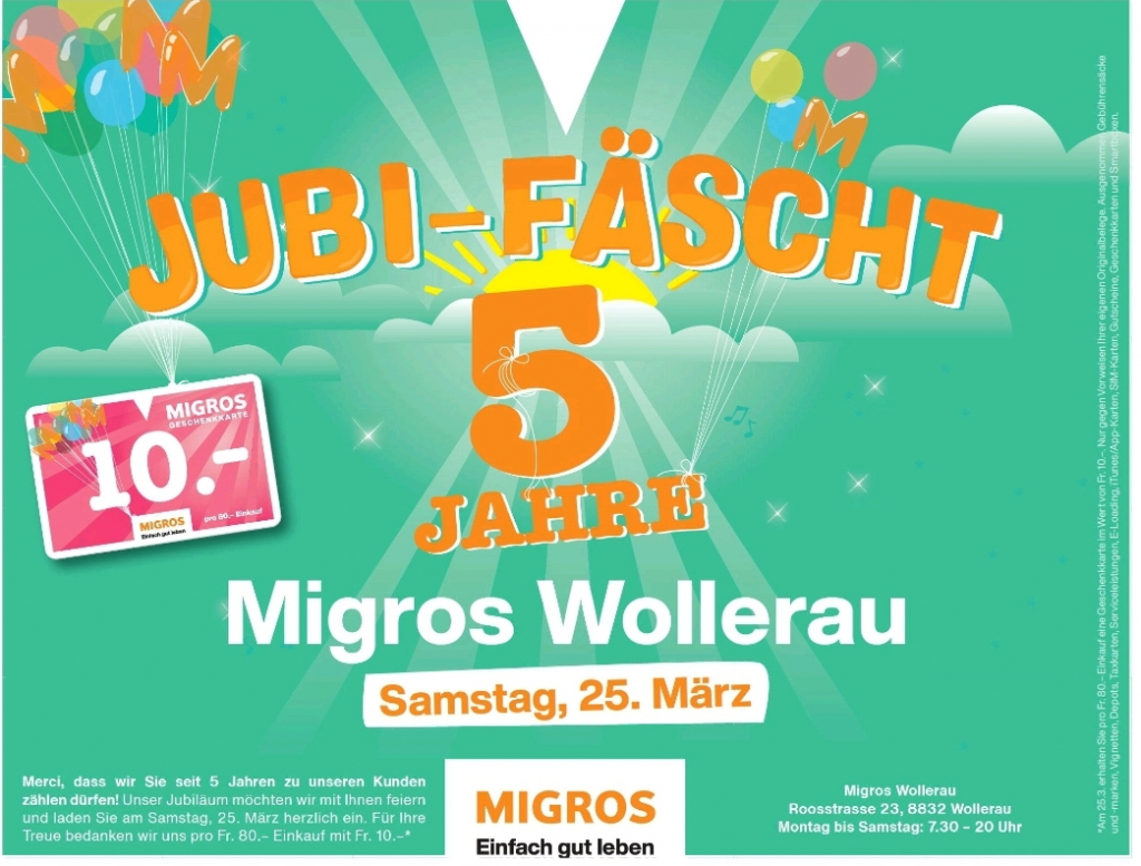 Zum 5-jährigen Jubiläum des Migros Wollerau gibt es am Samstag 25. März 2023 einen 10-Franken Gutschein ab 80 CHF Einkauf.