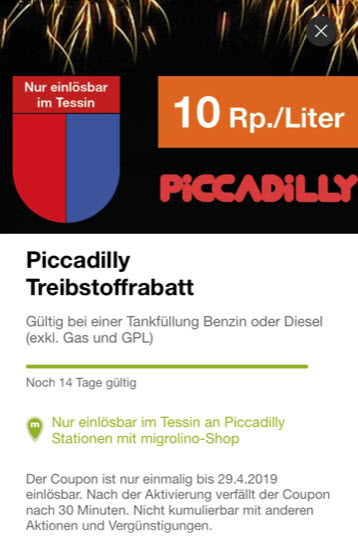 Bei Piccadilly erhält man bis zum 29.4.2019 via Migrolino-App 10 Rp./Liter Rabatt auf eine Tankfüllung Benzin oder Diesel. Ideal für alle Leute, welche die Ostertage in der Sonnenstube der Schweiz verbringen 😉