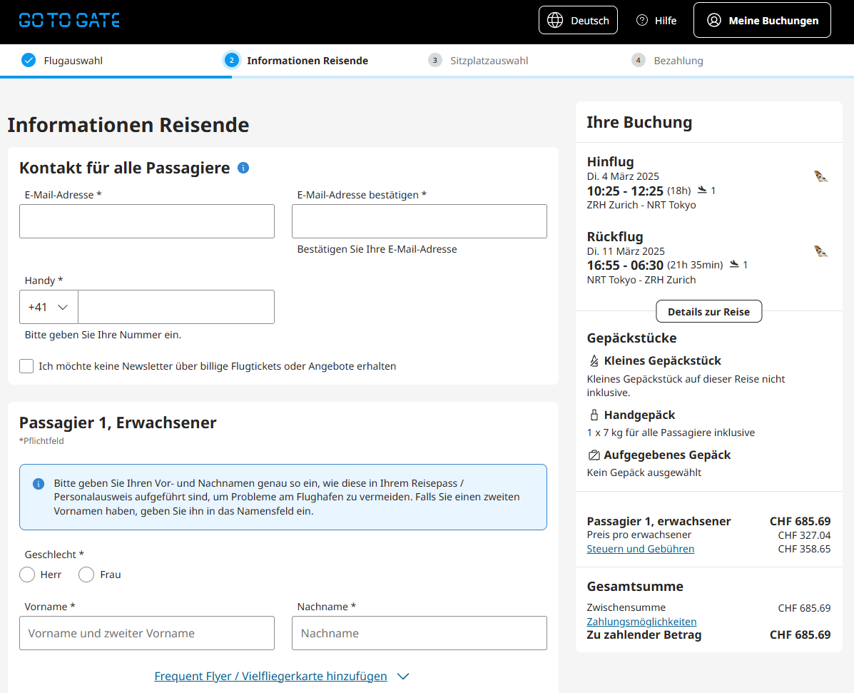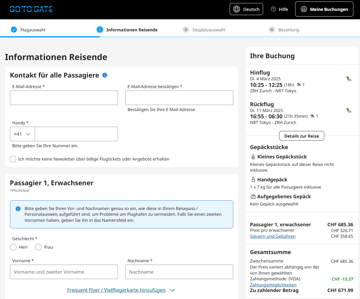 gotogate Buchungsseite ZRH NRT über skyscanner