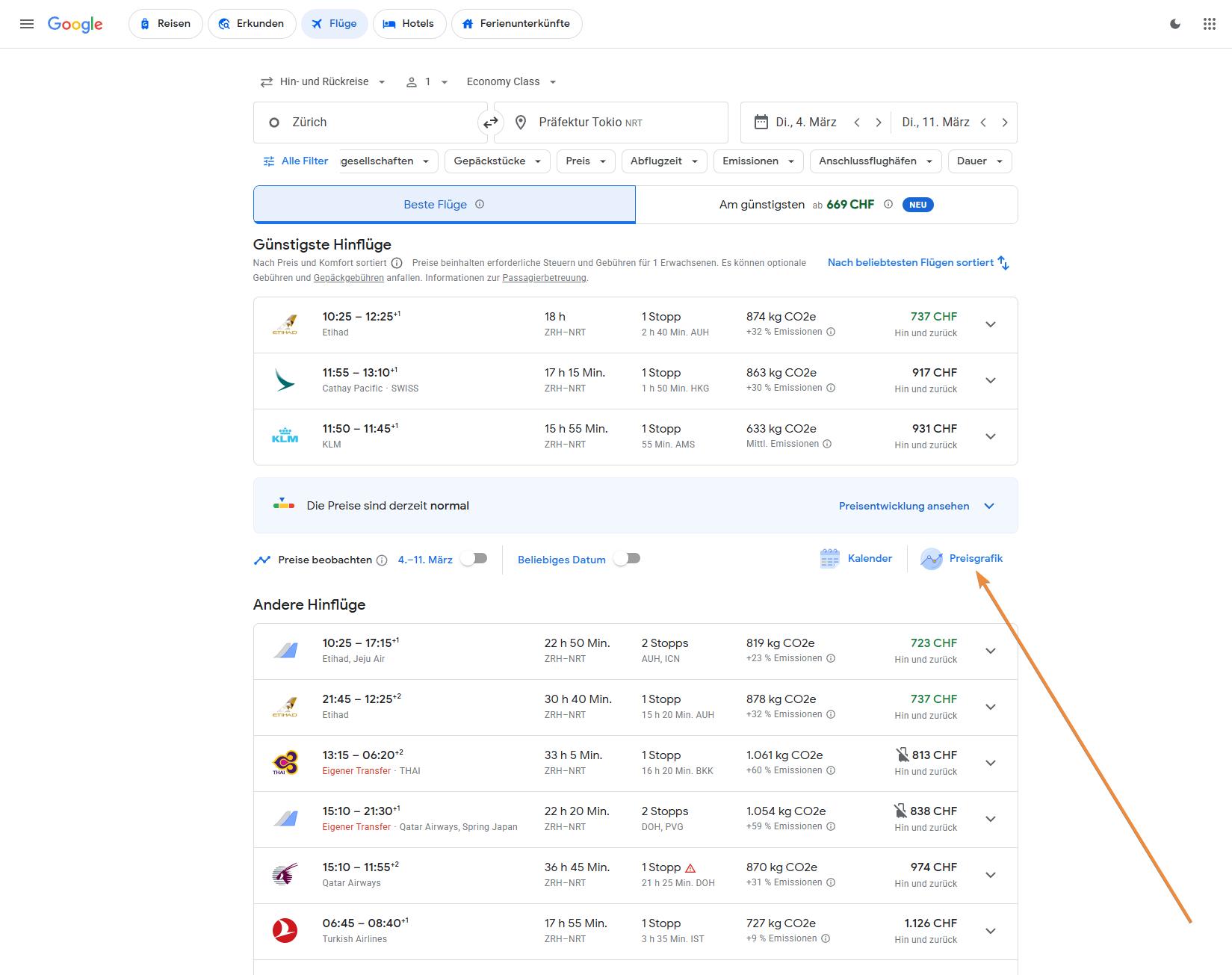 Meiner Meinung nach bietet Google Flights die beste Übersicht um die günstigsten Daten für einen Flug zu finden. Man kann die Reisedauer schnell umstellen, um ggf. für kürzere/längere Reisen bessere Flugpreise zu erhalten. Am besten arbeitet ihr dazu mit der “Preisgrafik”: