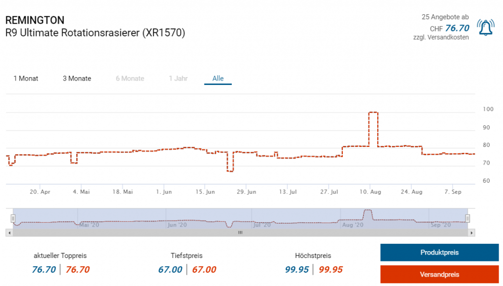 Bei Amazon gibts derzeit den Herrenrasierer von Remington, dem R9 mit der Modellnummer XR1570 zum Bestpreis von knapp 51 Franken. Laut toppreise solls den Rasierer in der Schweiz nie günstiger als für CHF 67.- gegeben haben.