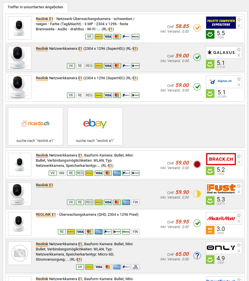 Im Reolink Store oder bei Amazon gibts derzeit die Überwachungskamera E1 zum Aktionspreis von CHF 31.- resp. CHF 32.-, laut toppreise sollen die Vergleichspreise bei knapp 59 Franken starten.