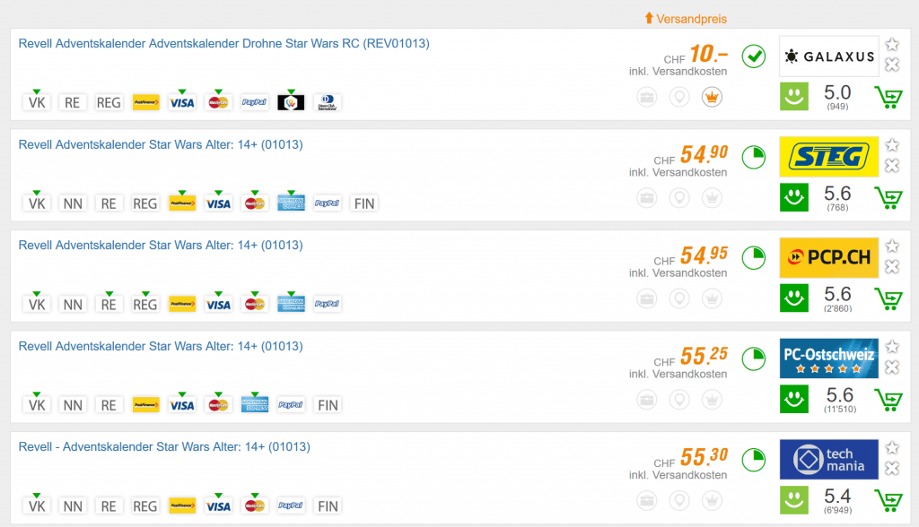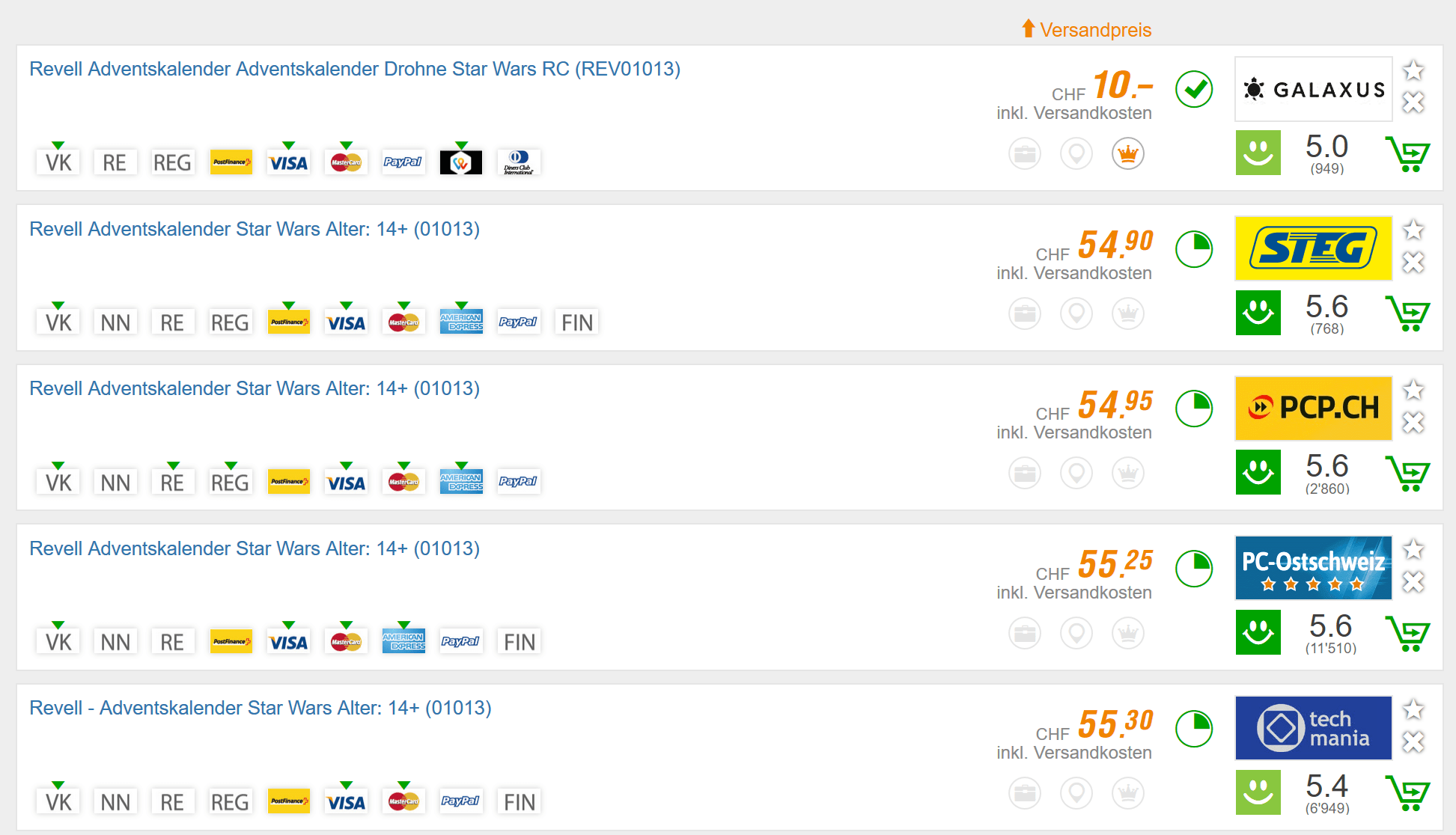 Galaxus verrechnet zusätzlich 9 Franken für die Lieferung, wenn der Mindestbestellwert von CHF 50.- nicht erreicht wird. Am besten bestellt man die Adventskalender also zusammen mit etwas anderem.