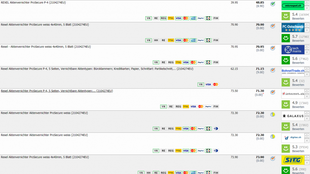 Bei microspot erhält man gerade den REXEL Aktenvernichter ProSecure P-4 für CHF 39.95. Obendrauf kommen noch CHF 8.90 für die Lieferung. Zweitbester Preis in der Schweiz ist laut toppreise bei CHF 70.90