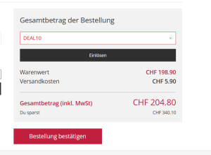 Mit dem Gutscheincode “DEAL10” sollte es nochmals 10.- Rabatt geben.