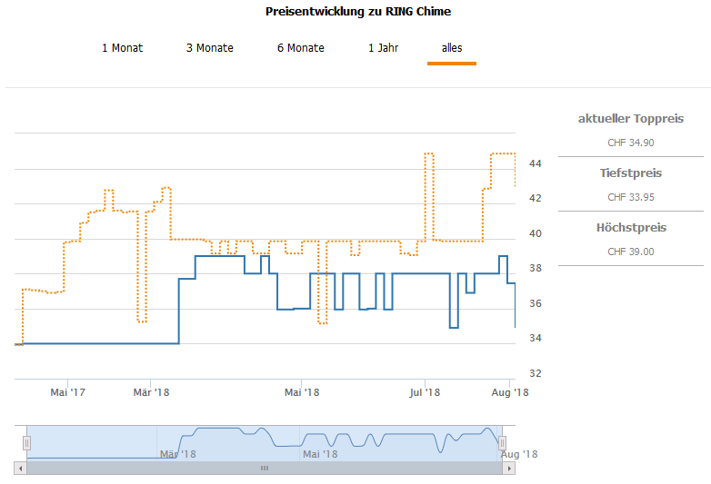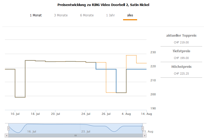 Video Doorbell 2 gab es gemäss toppreise noch nie günstiger als für 199.- CHF, der zweitbeste Preis ist aktuell bei 223.30 CHF.