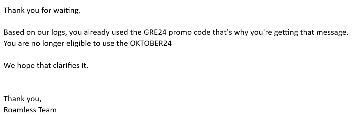 Danke für die Abkklärung. :-). Ich habe kürzlich auch den Code GRE24 genutzt. Schade, erwähnen sie nicht, dass man nicht noch einen anwenden kann. Ich bin mal gespannt, ob es künftig wieder möglich sein wird, einen Code anzuwenden.