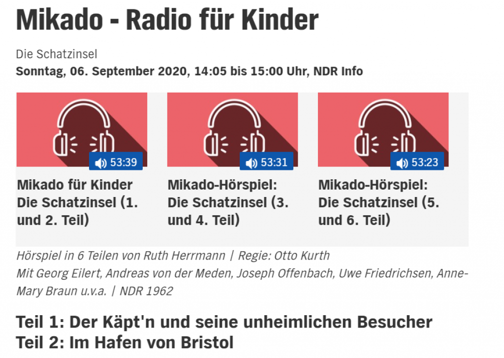 Bei NDR erhält man das Hörbuch Die Schatzinsel von Robert Louis Stevenson momentan kostenlos.