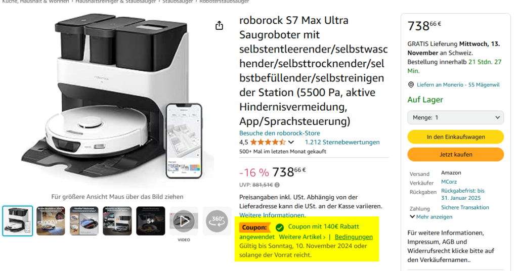 Aktuell bietet Amazon den Roborock S7 Max Ultra Saugroboter für den neuen Bestpreis von umgerechnet 564.65 Franken an. Dieses Angebot ist befristet, leider ist nicht bekannt, bis wann es gültig ist. Der aktuelle Vergleichspreis liegt bei 699.- Franken.